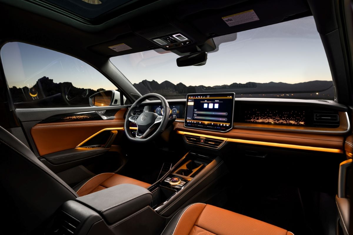 La próxima generación del sistema Digital Cockpit Pro de 10,25 pulgadas de Volkswagen es estándar, y un nuevo sistema de información y entretenimiento central con MIB4 cuenta con una pantalla estándar de 12,9 pulgadas junto con un control giratorio ubicado en la consola central para un fácil ajuste del volumen junto con Drive Mode Select y los nuevos «Atmospheres» disponibles.